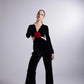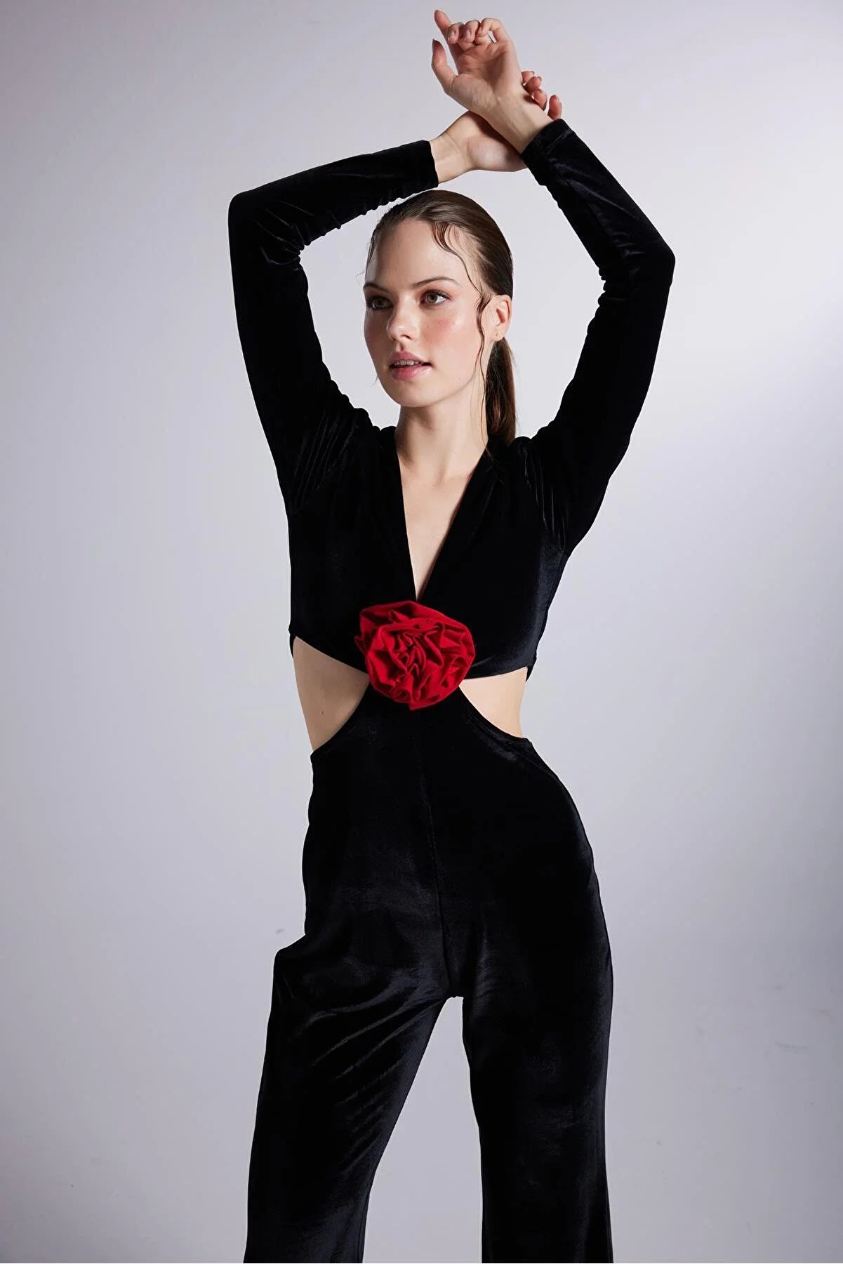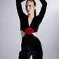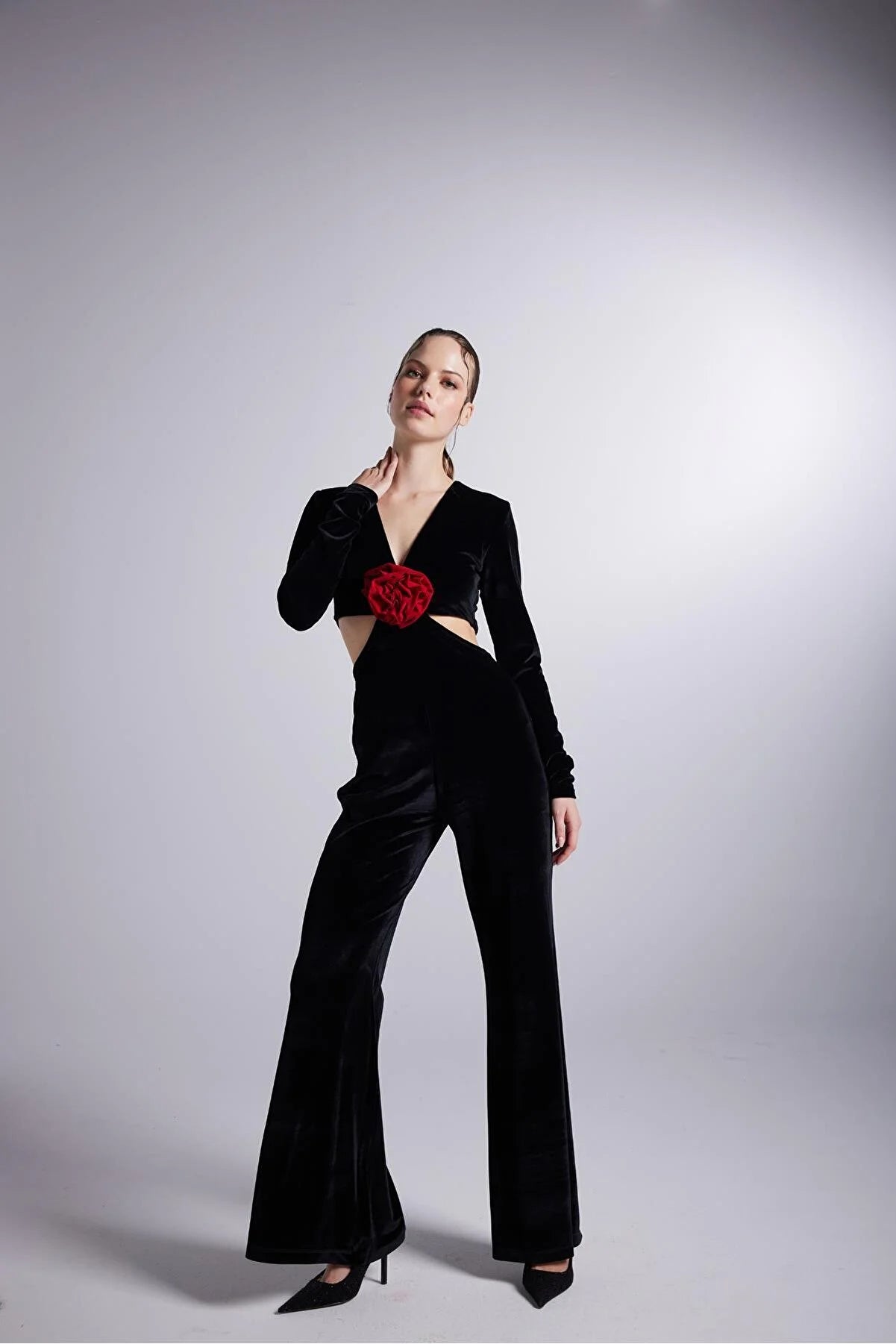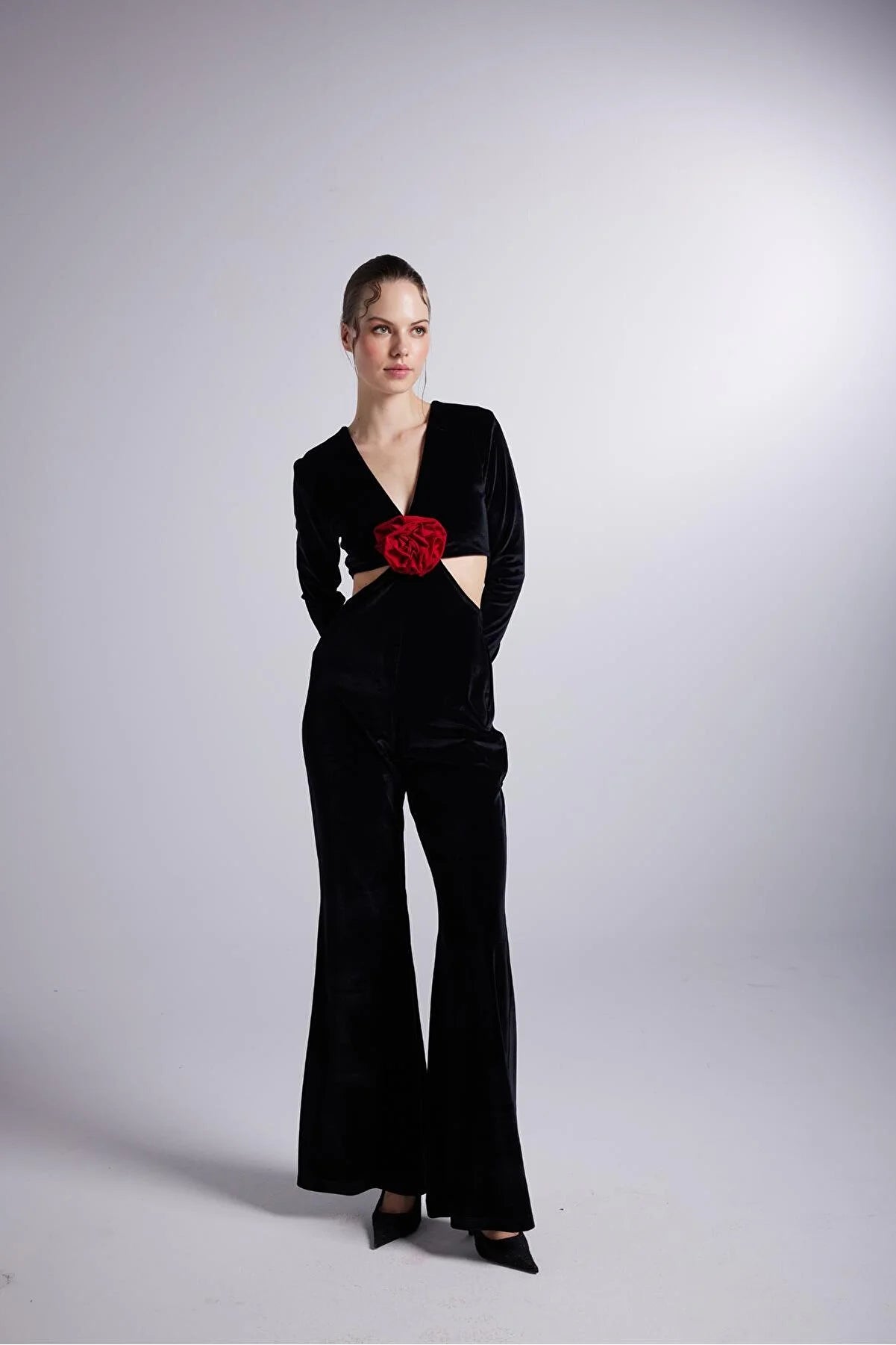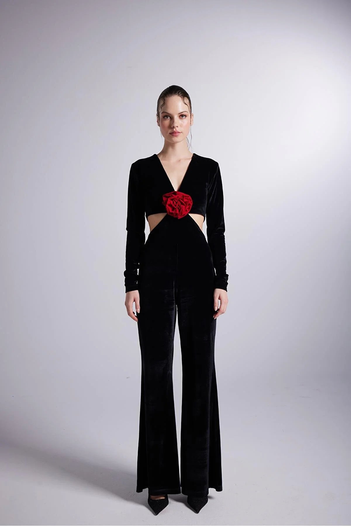 Black Floral Detailed Flare Leg-V-Neck Jumpsuit