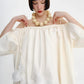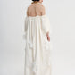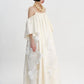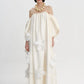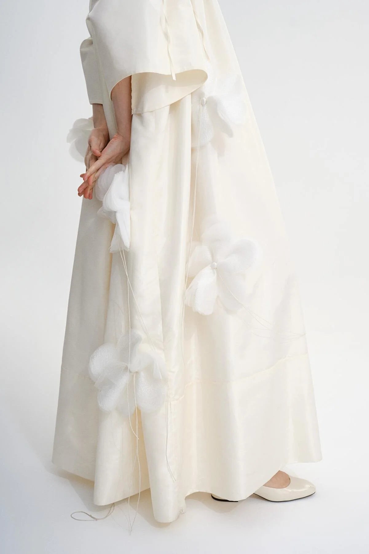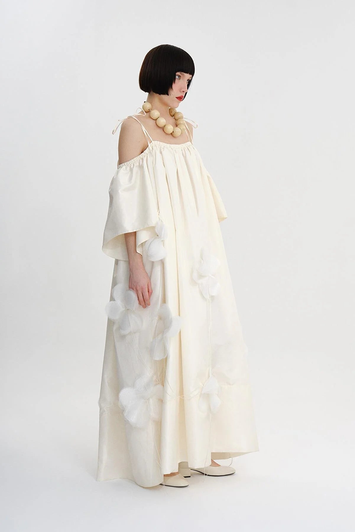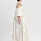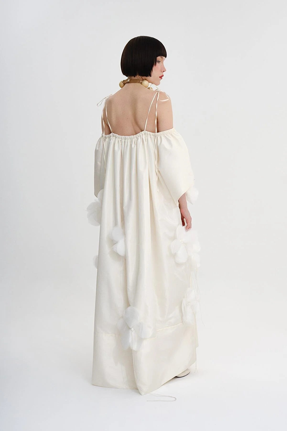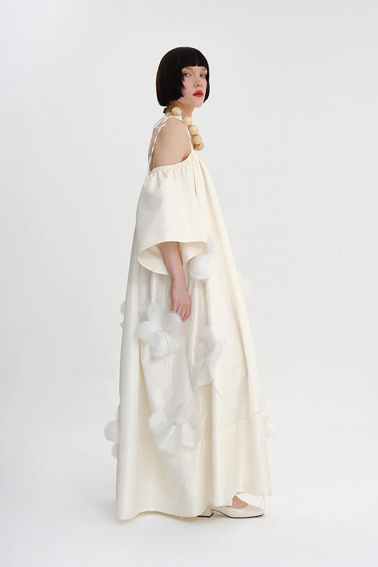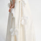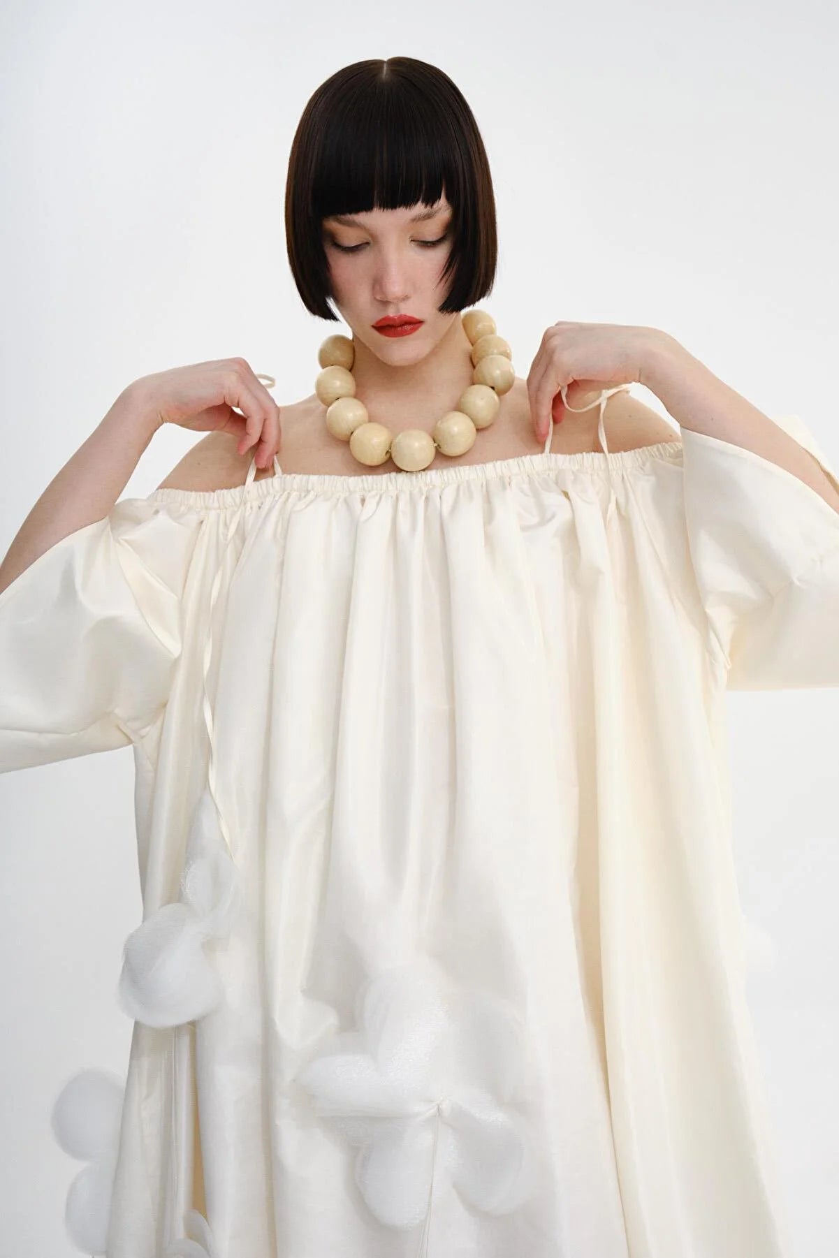 Strapless, elasticated and gathered neckline, rope straps on the shoulder, dropped short sleeves, oversize, organza flower appliqué.