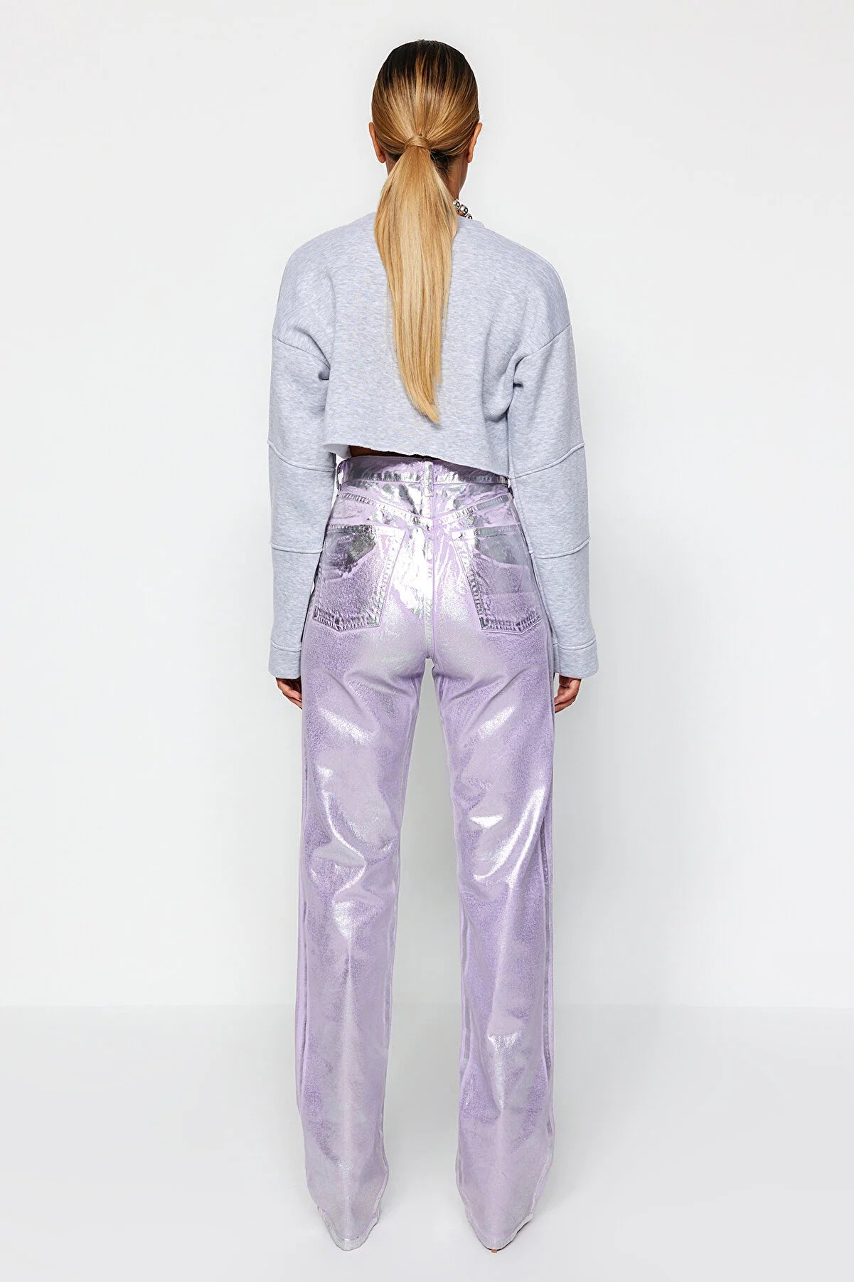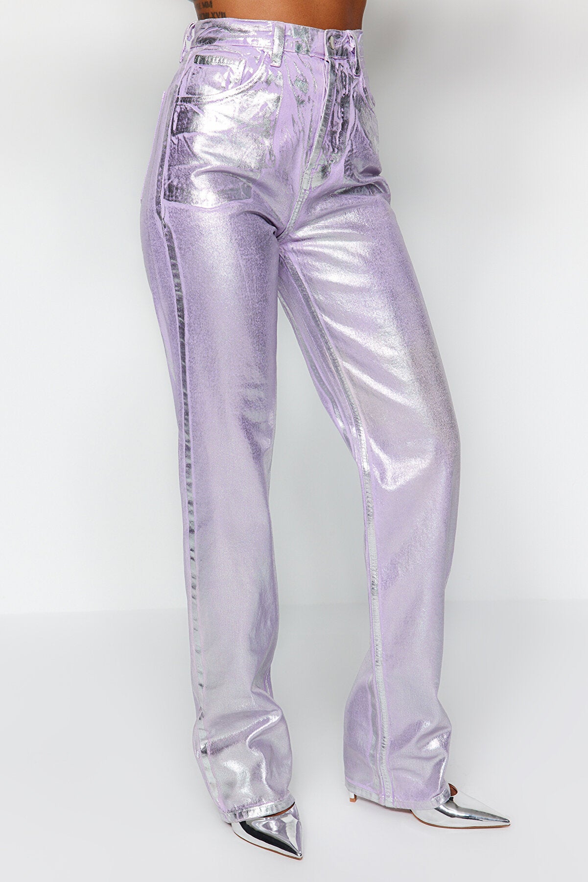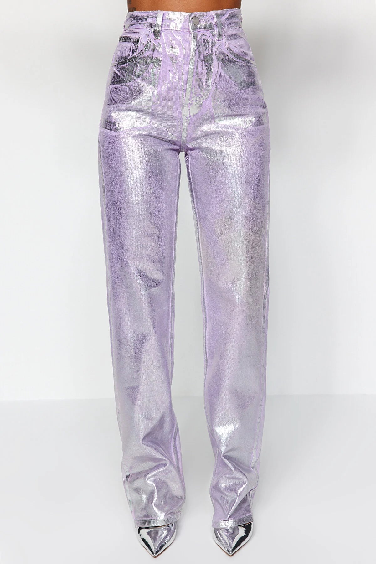 Lilac Shiny Metallic Printed High Waist Wide Leg Jeans
