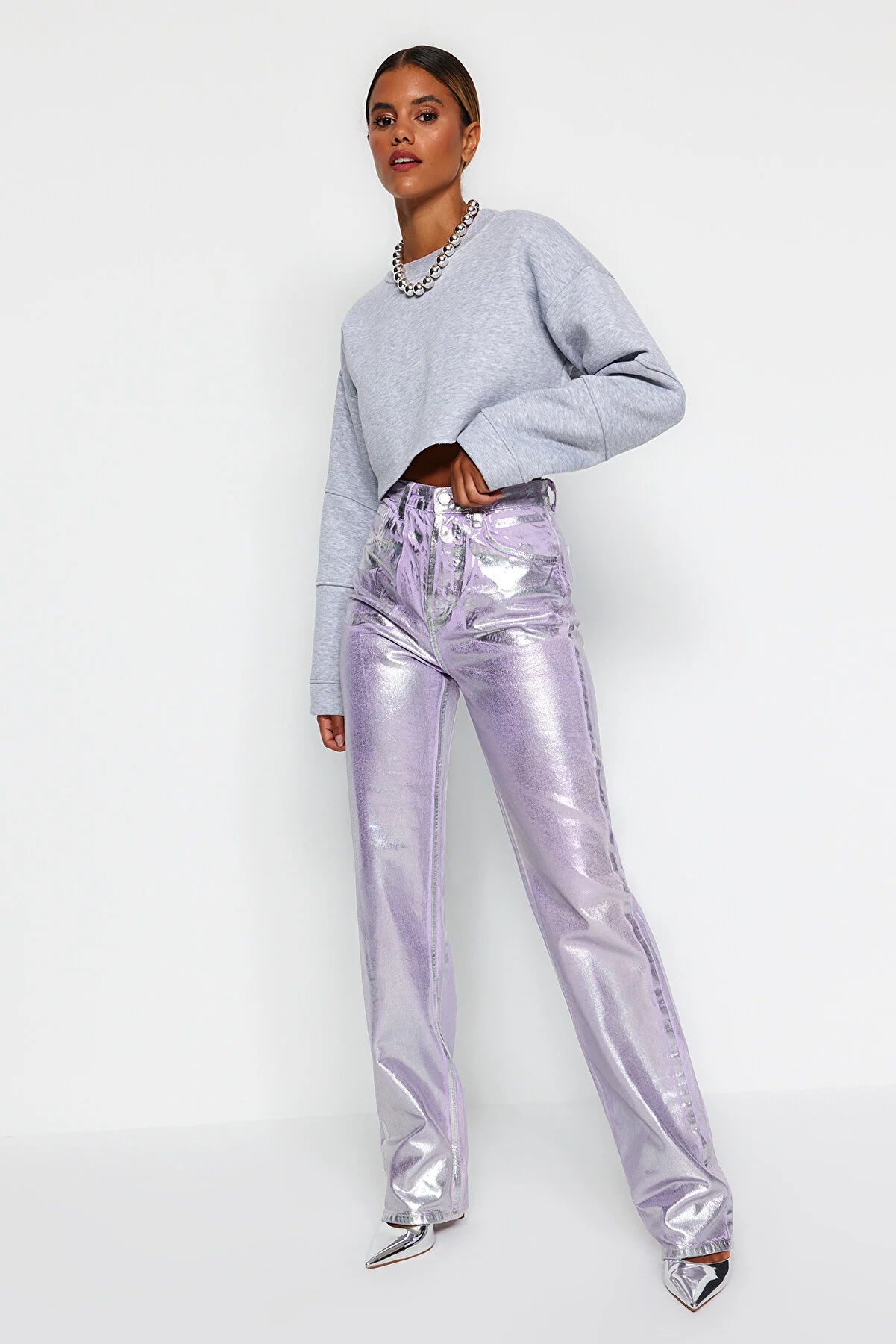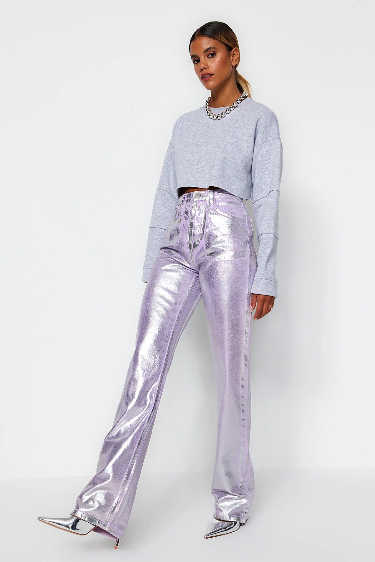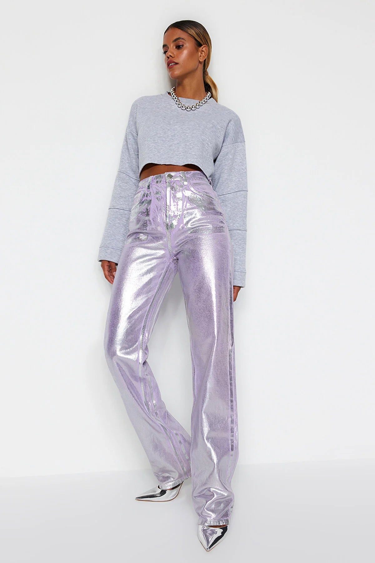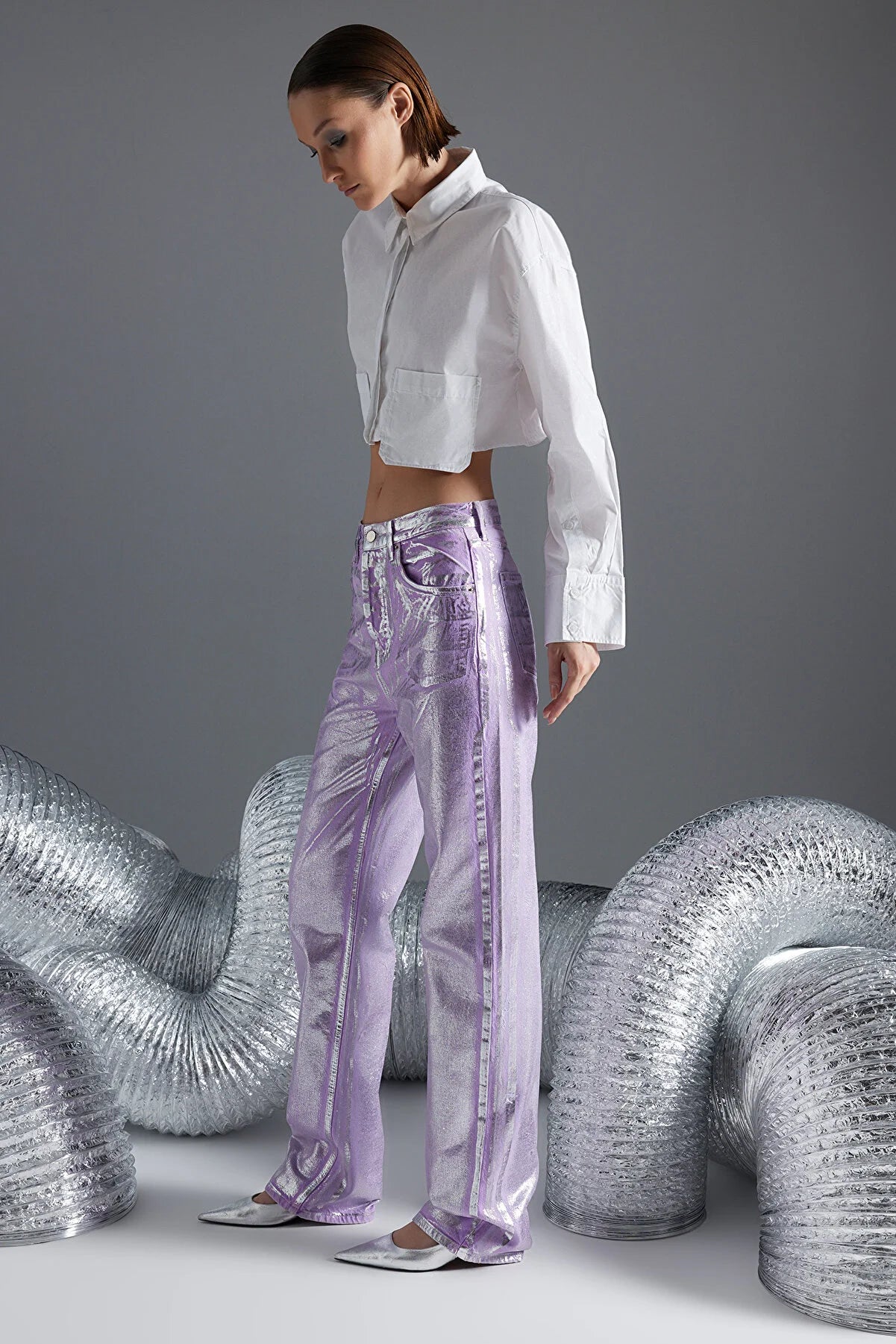Lilac Shiny Metallic Printed High Waist Wide Leg Jeans