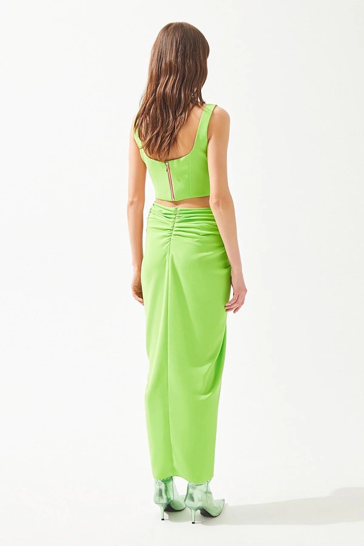 Green Front Knot Detail Deep Slit Crepe Skirt