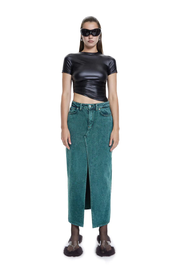 Make a bold fashion statement with the short-sleeve, asymmetrical Boujee Crop Top crafted from leather-like fabric.