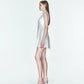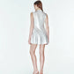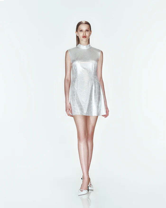 Our dress features a metallic foil print, enhancing its glossy reflective fabric.