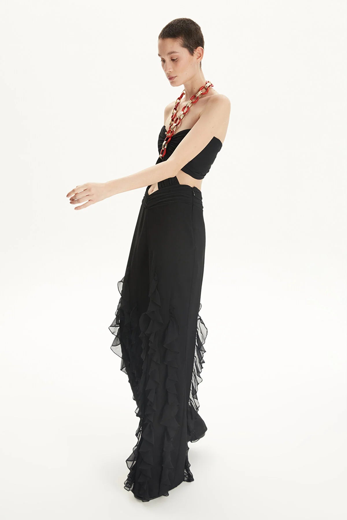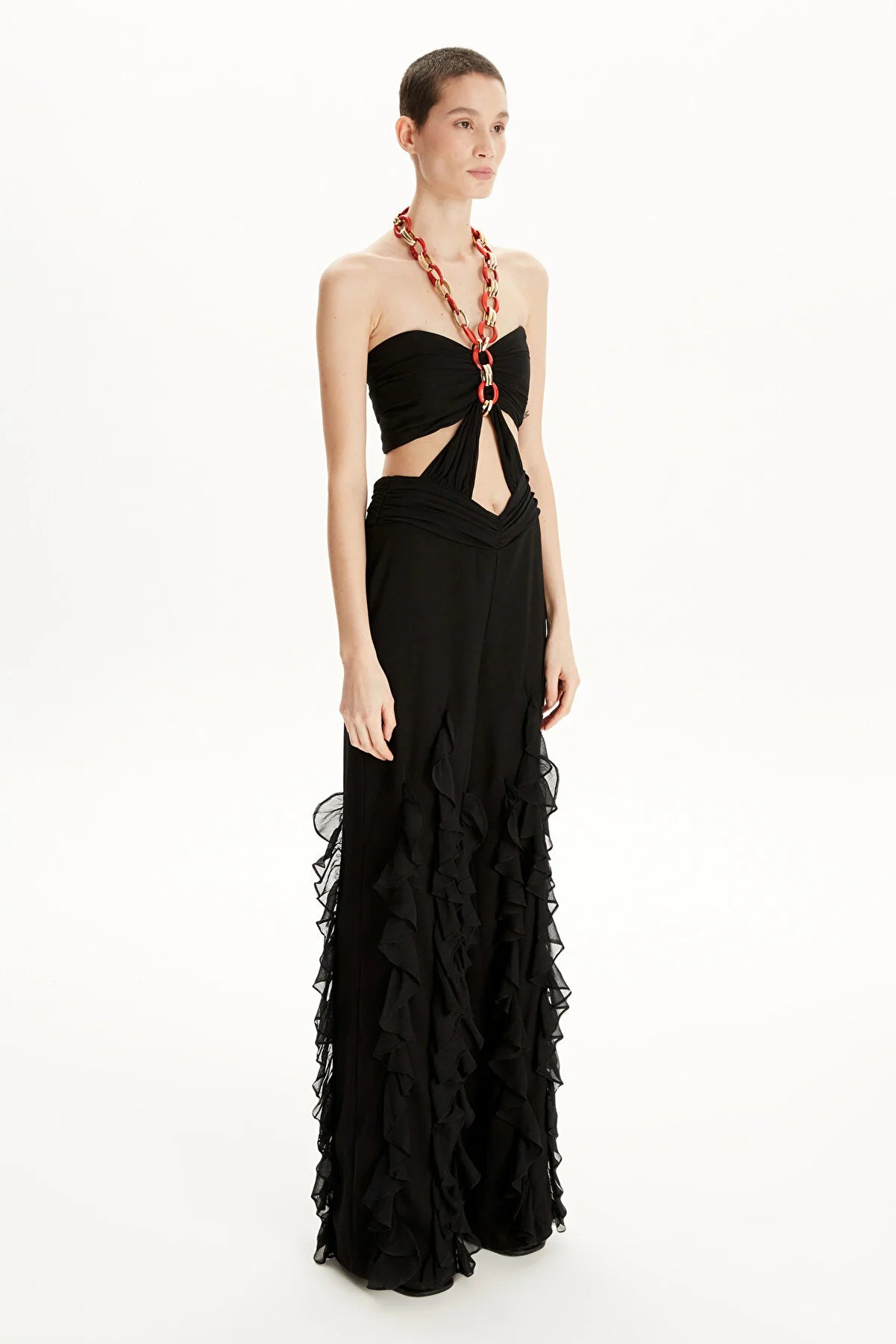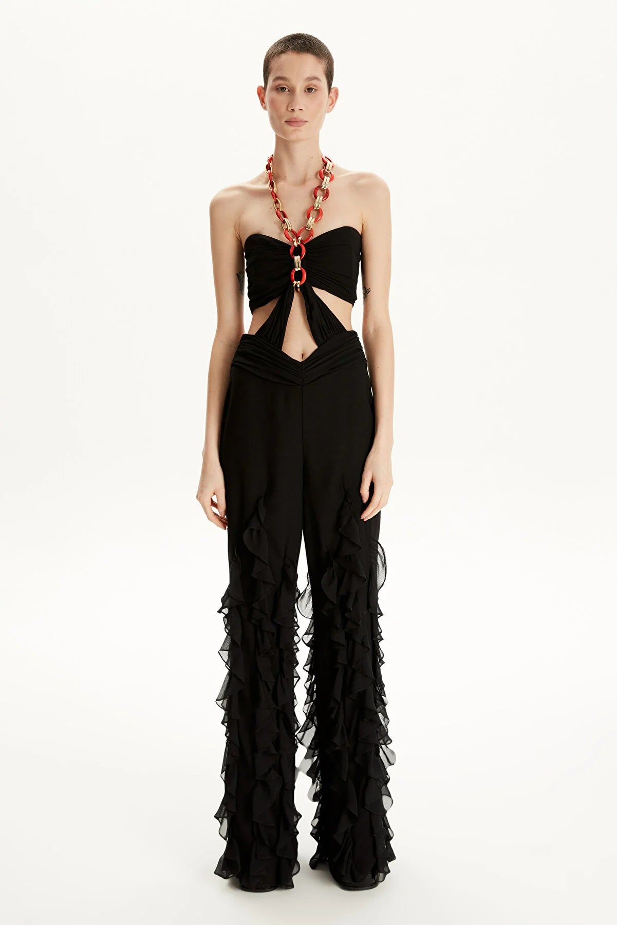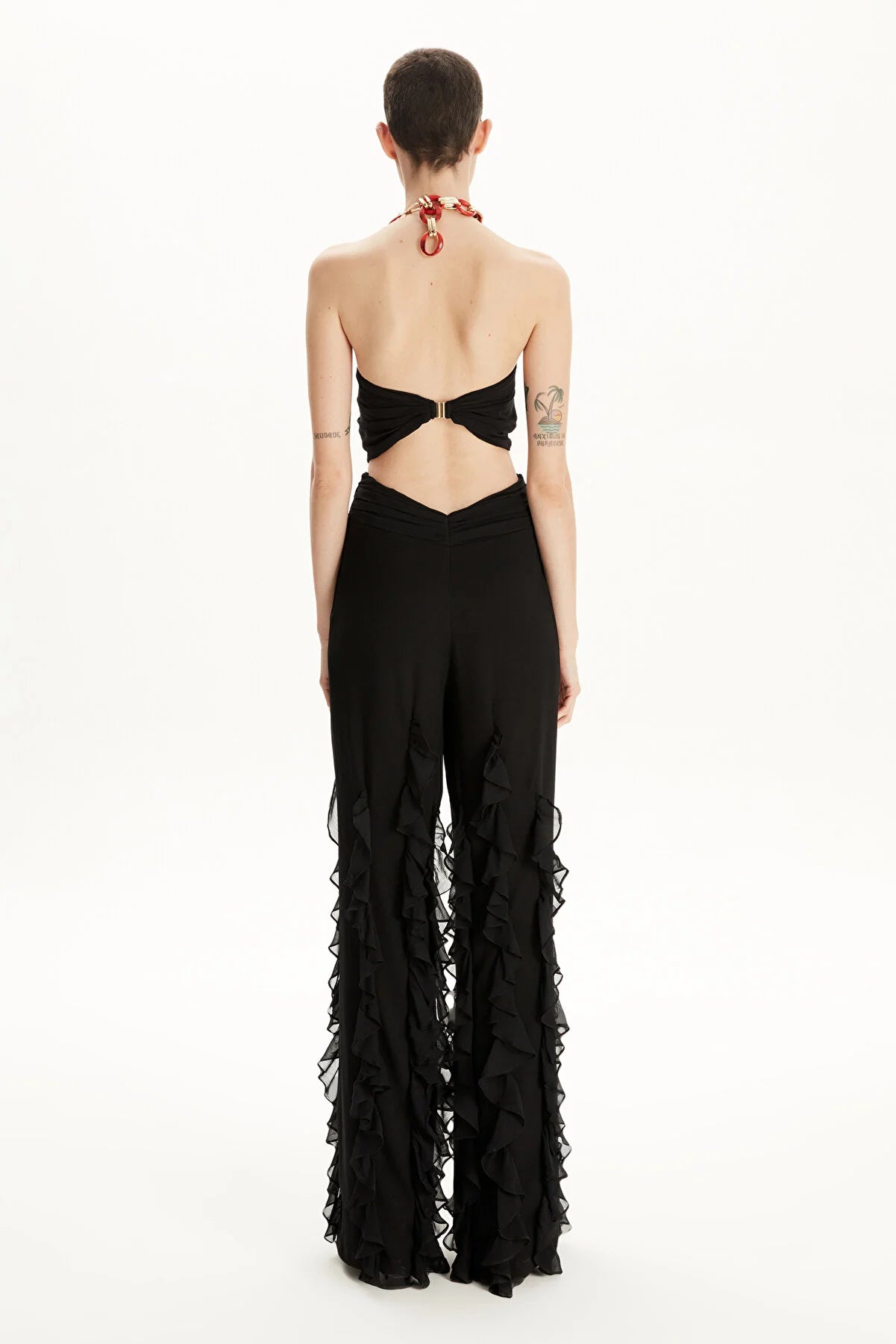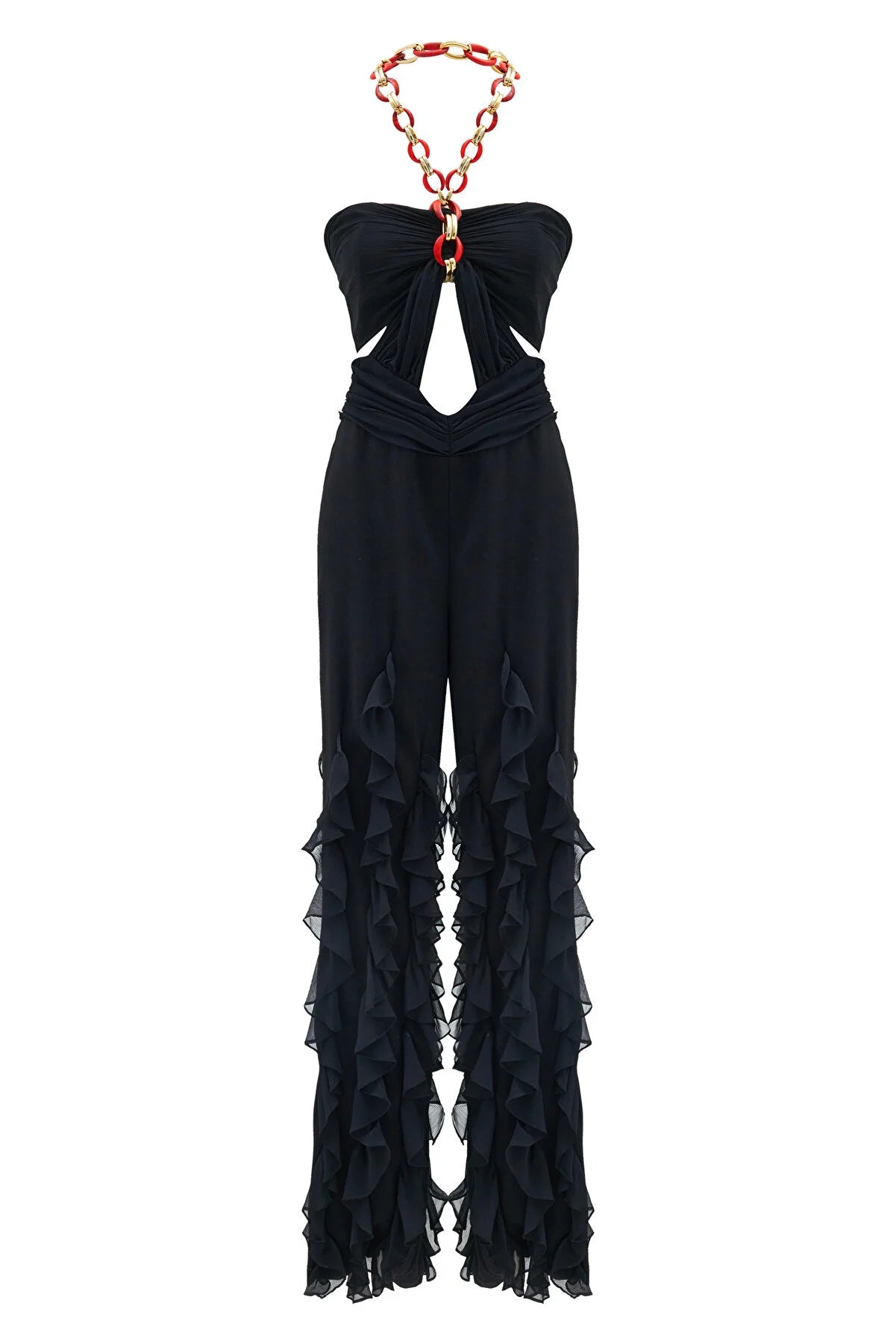 Black Halter Neck Accessory Detailed Ruffle Jumpsuit