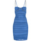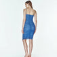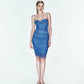The dress with stone-embellished trim running along the bust seam, accompanied by a jeweled strap and side ruching.