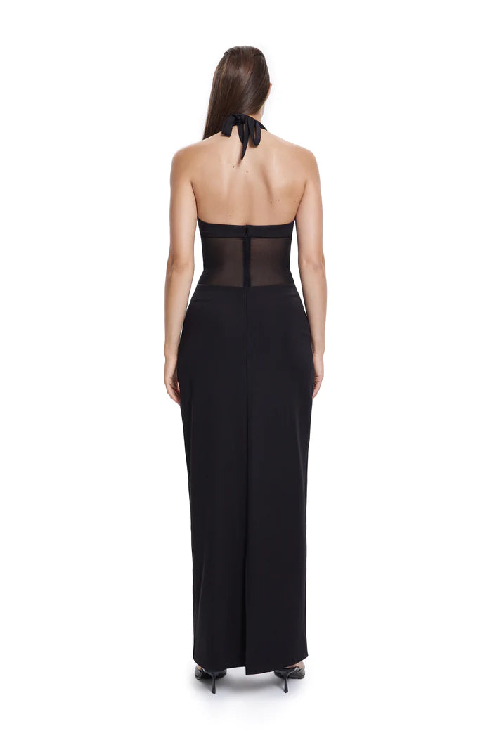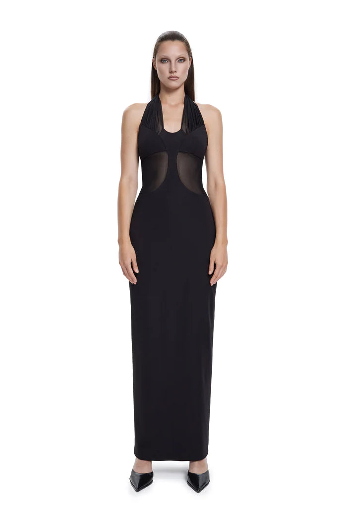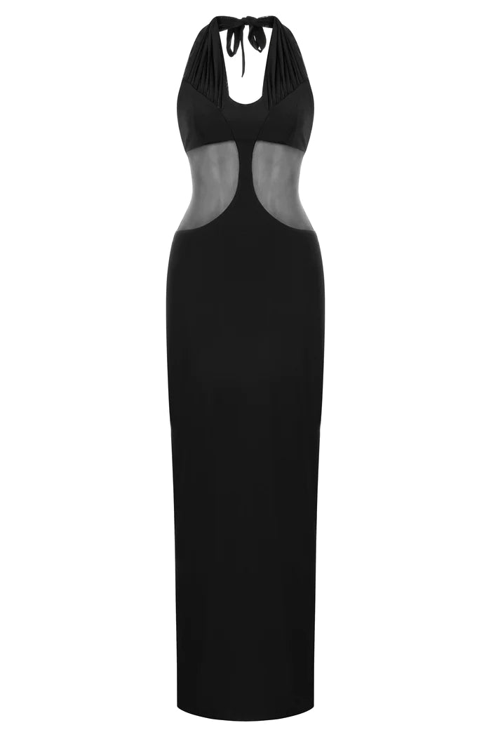 The tulle details on the sides and straps add a feminine look, while the body-hugging black fabric keeps you comfortable. The long dress is lined, so you can wear it to any occasion.