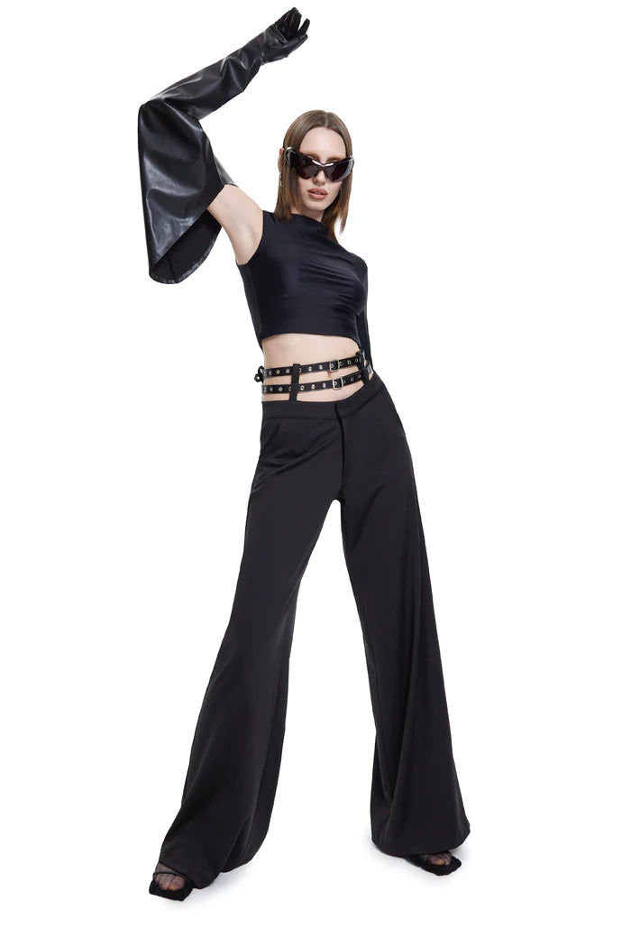 The body features snap fasteners, ensuring a secure fit and a sleek silhouette. Adding a touch of flair, the short sleeve is adorned with a cross-strap detail that sets this piece apart from the ordinary. Make a bold fashion statement and experience the effortless styling of this extraordinary addition to your collection.