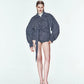 Oversized jacket with an asymmetric belted waist and bomber sleeves. Features laser-printed K-logo on denim fabric. This jacket features elastic cuffs, a metal zipper closure at the front, and a contrasting printed lining, all in a deep blue hue.