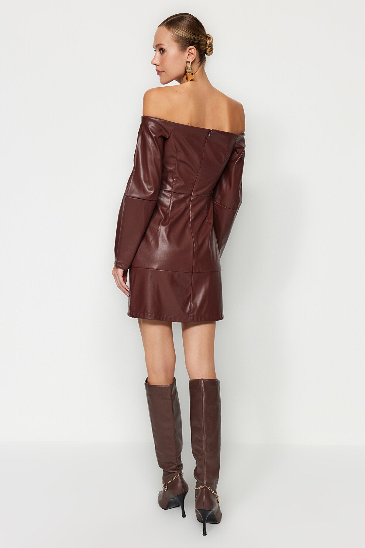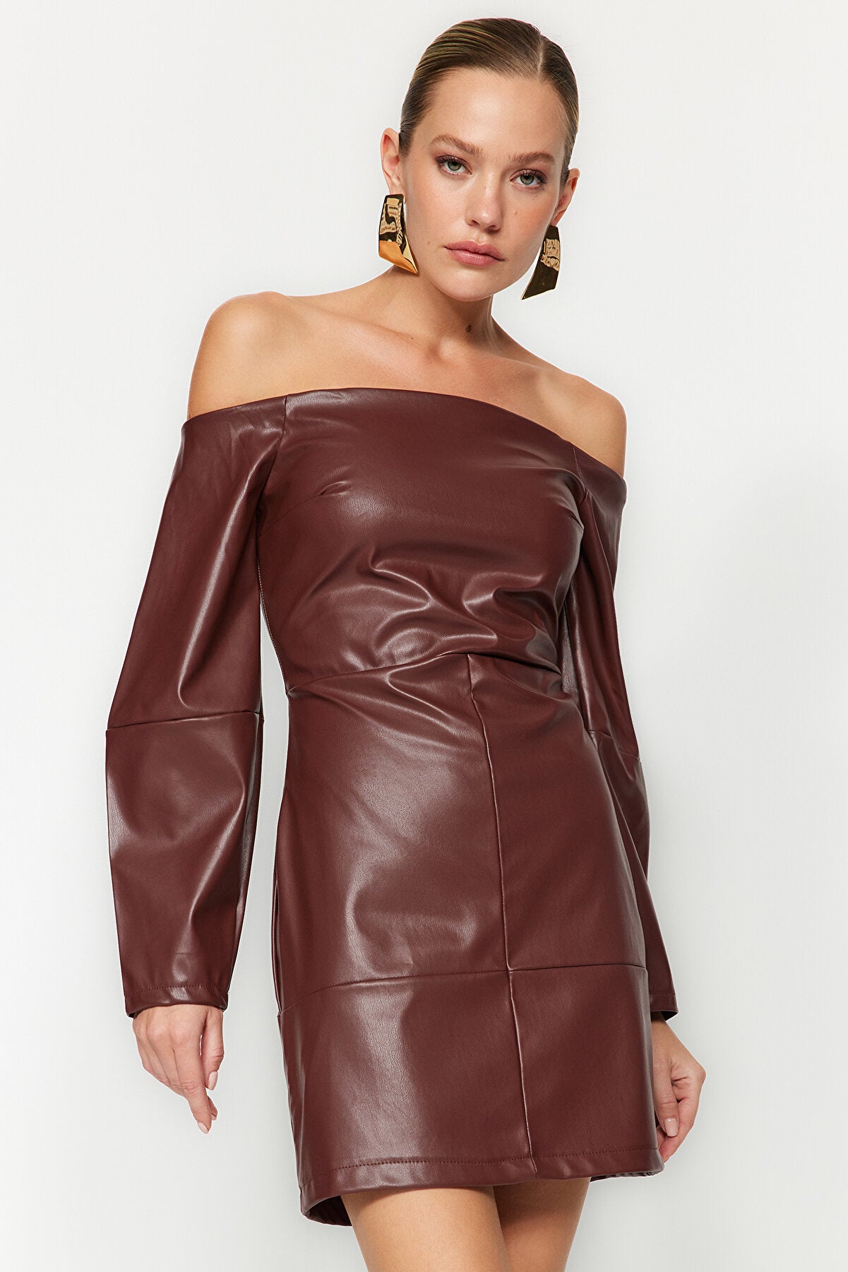 Brown Off Shoulder Faux Leather Midi Dress