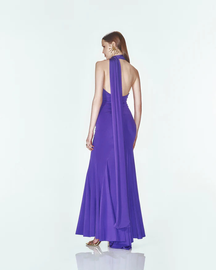 Crafted from jersey fabric, this purple dress is tailored to hug the body.