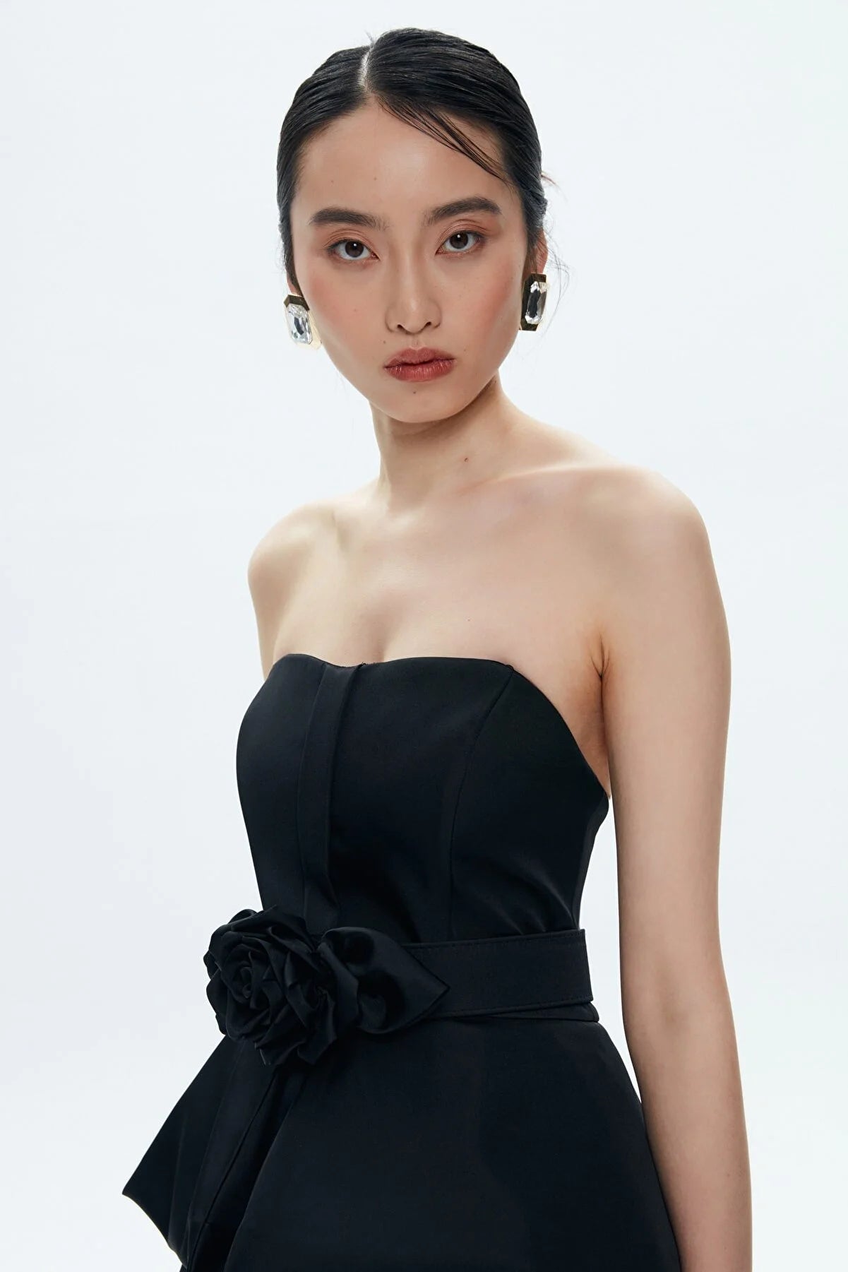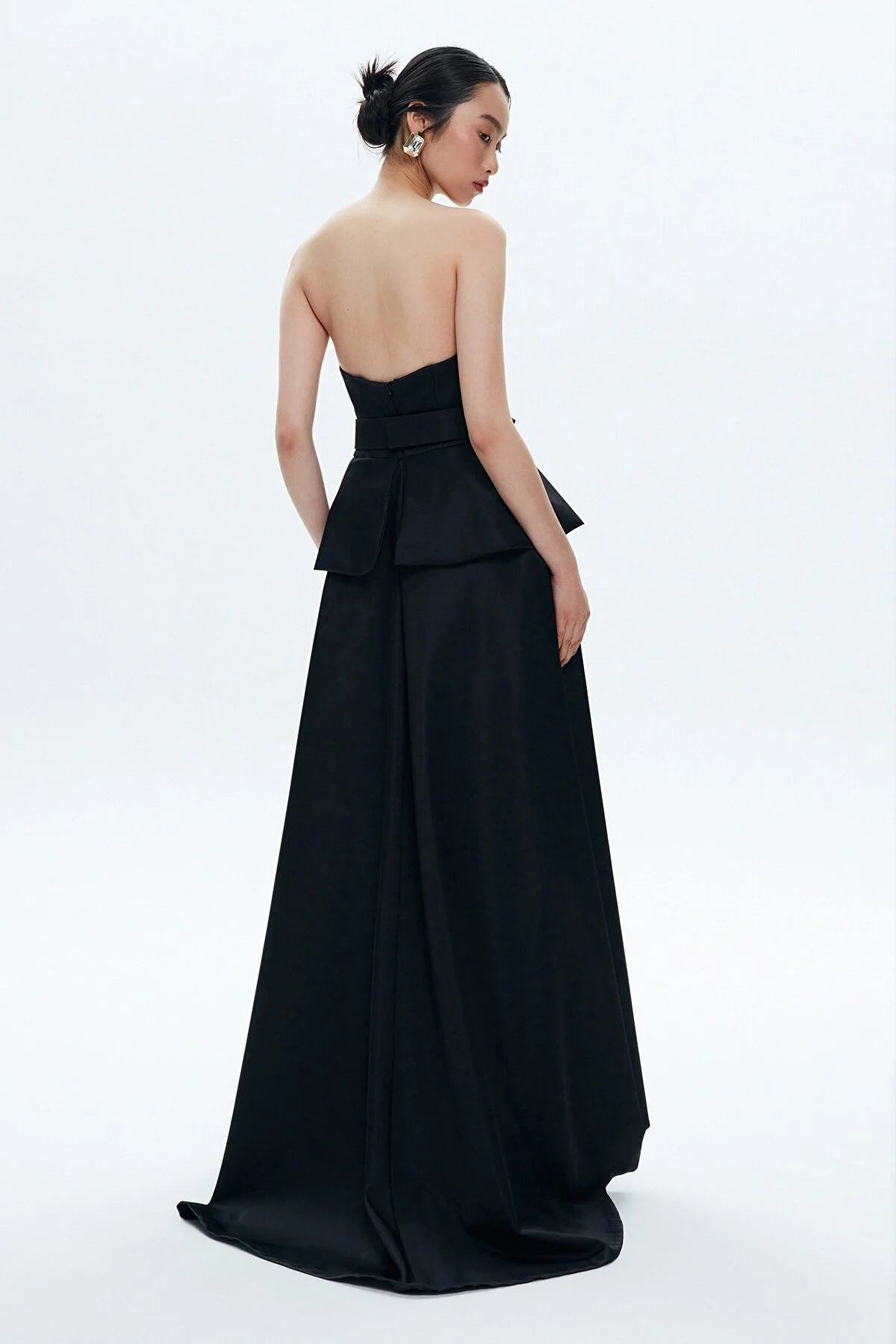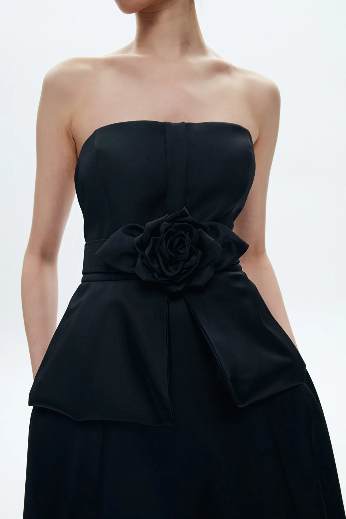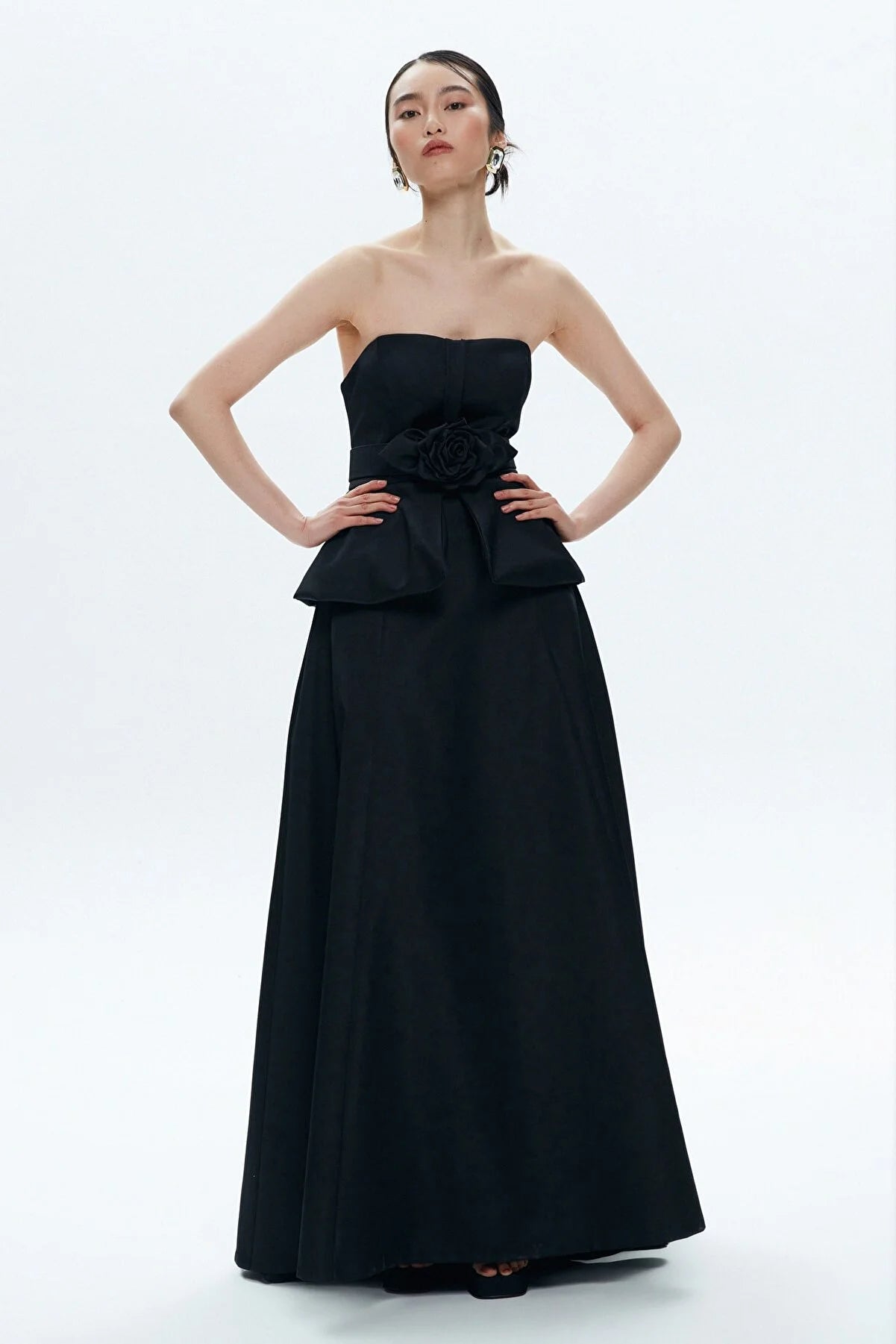 Strapless Black Taffeta Flower Detailed Maxi Dress