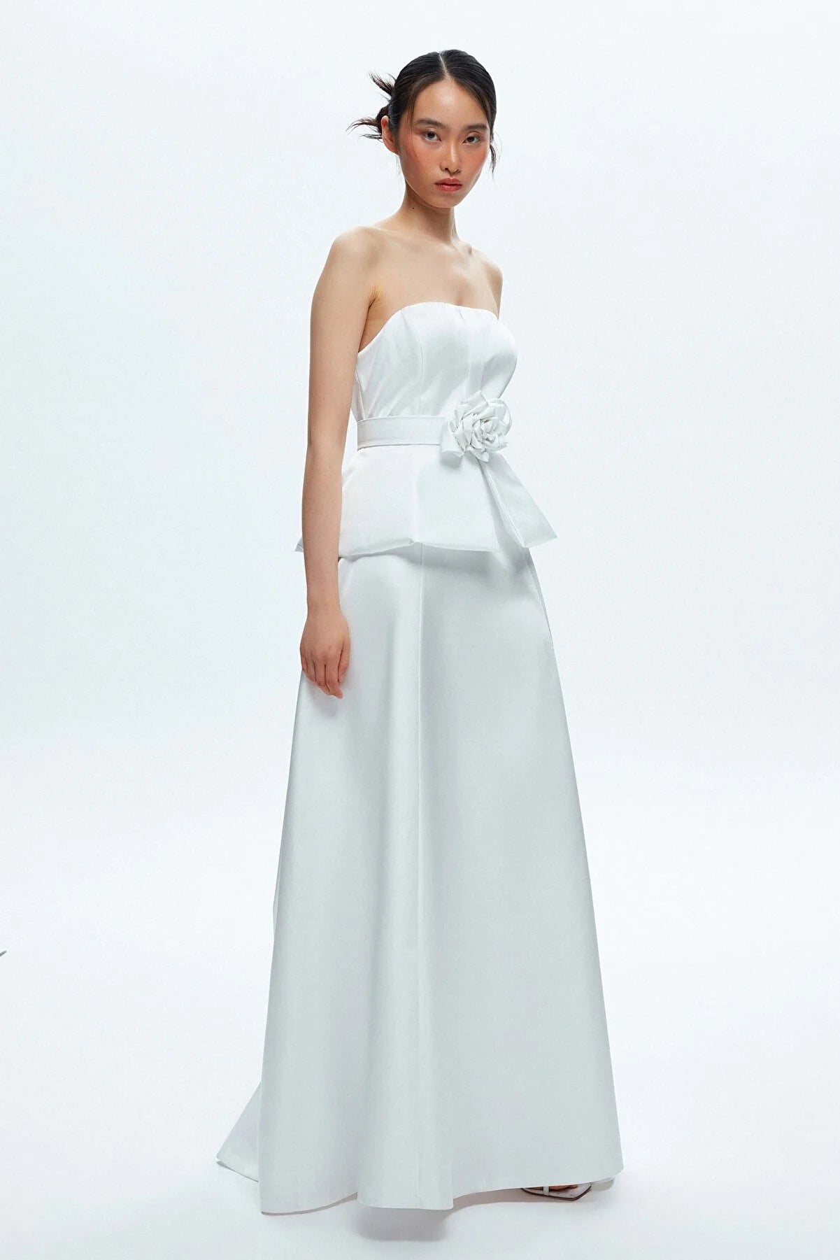 Strapless White Taffeta Flower Detailed Maxi Dress