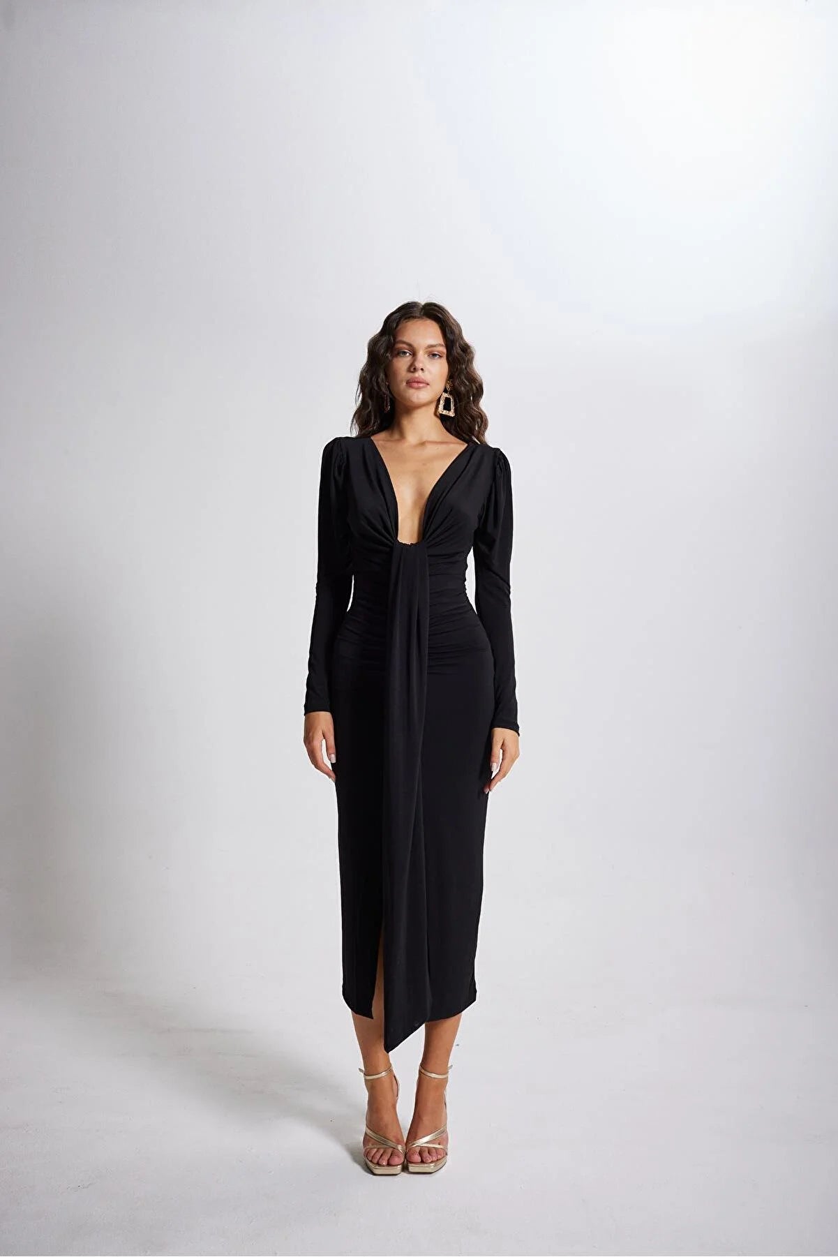 Black Front Slit Detailed Midi Dress