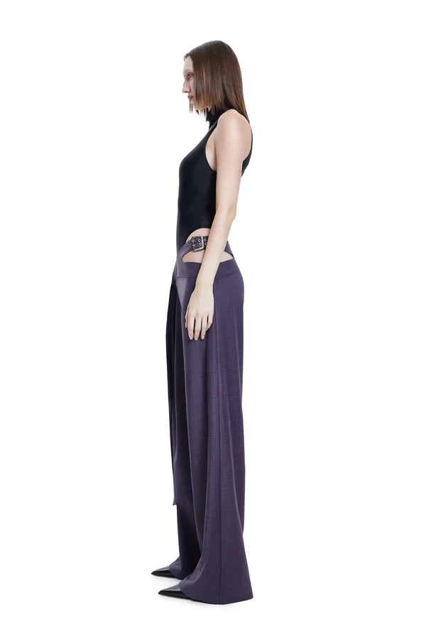 The asymmetrical waistline and zipper detail add a touch of edginess to the overall look. A distinct strip extends from the waist, creating an eye-catching cutout that adds an element of playfulness to the pants. The loose fit ensures both comfort and ease of movement, while the mid-waist design flatters your figure.