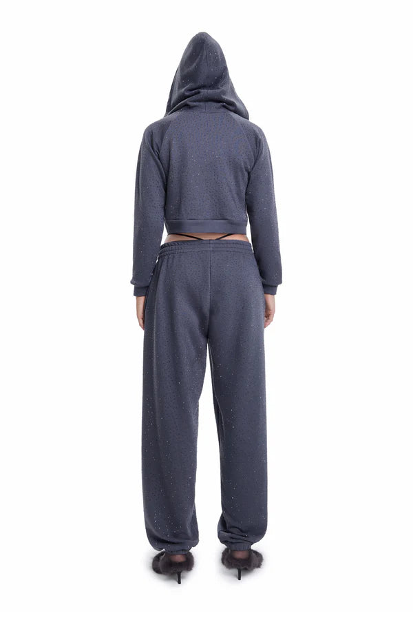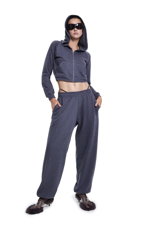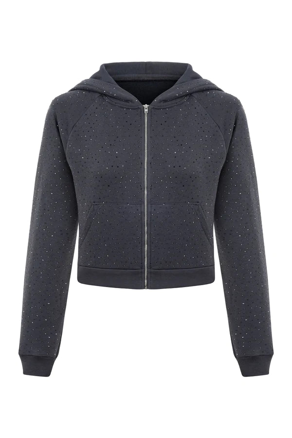 Introducing our stylish Stellar Zip Hoodie, cropped for a modern look and embellished with shimmering stones. This hoodie cardigan features convenient pockets and adds a touch of sparkle to your ensemble, making it a standout choice for any occasion.